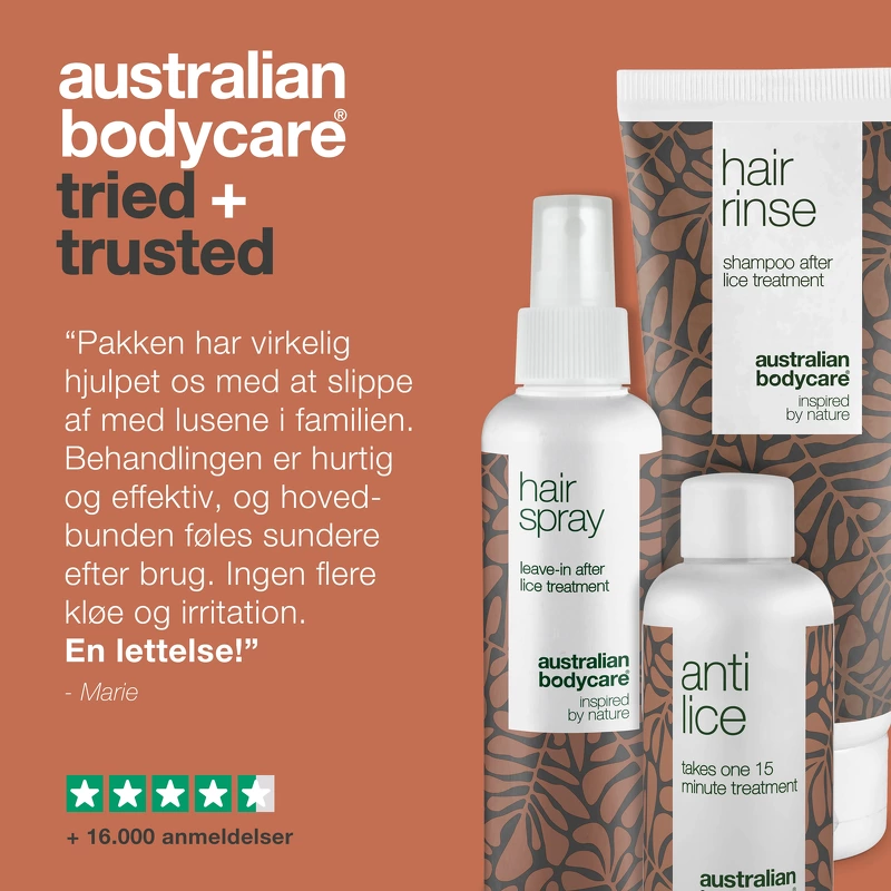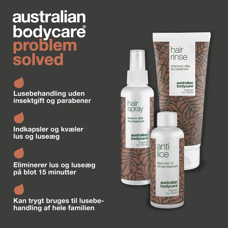 Australian Bodycare Head Lice Kit er en sampak til effektiv lusebehandling med lusekur, luseshampoo og lusespray. Alle produkterne indeholder Tea Tree Oil, der modvirker bakterier og hovedbundsproblemer.