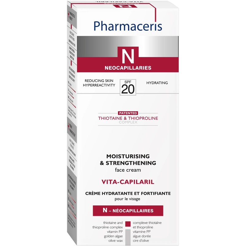 Pharmaceris N Vita Capilaril Moisturizing & Strengthening Face Cream SPF 20 er en dagcreme til daglig pleje af hud med rødme/hyperaktivitet i blodkar, hvor blodkarrene udvider sig og brister, og hvor huden samtidig viser tendens til at miste fugtigheden og udtørre. Den er med SPF 20, som giver medium beskyttelse mod solens UVA- og UVB-stråler.