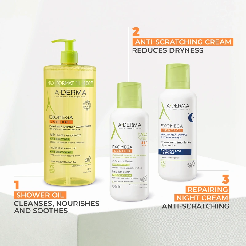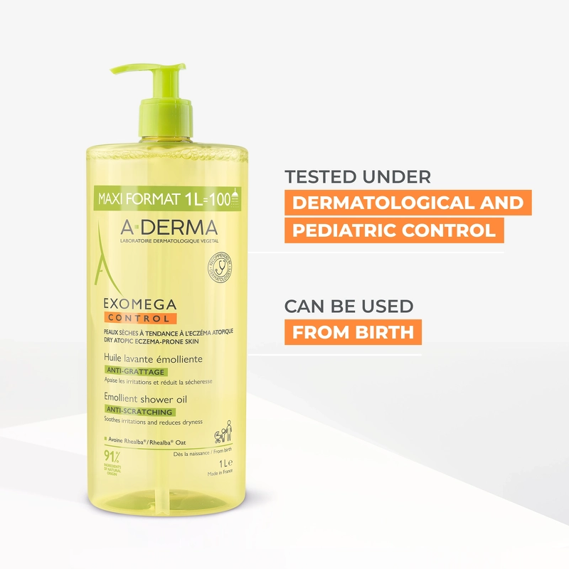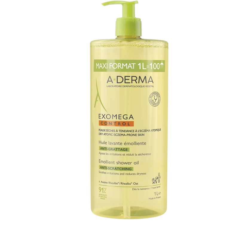 A-DERMA Exomega Control Shower Oil er en blødgørende og kløedæmpende vaskeolie, der renser, nærer og beskytter tør, sart og atopisk hud hos både børn og voksne.
