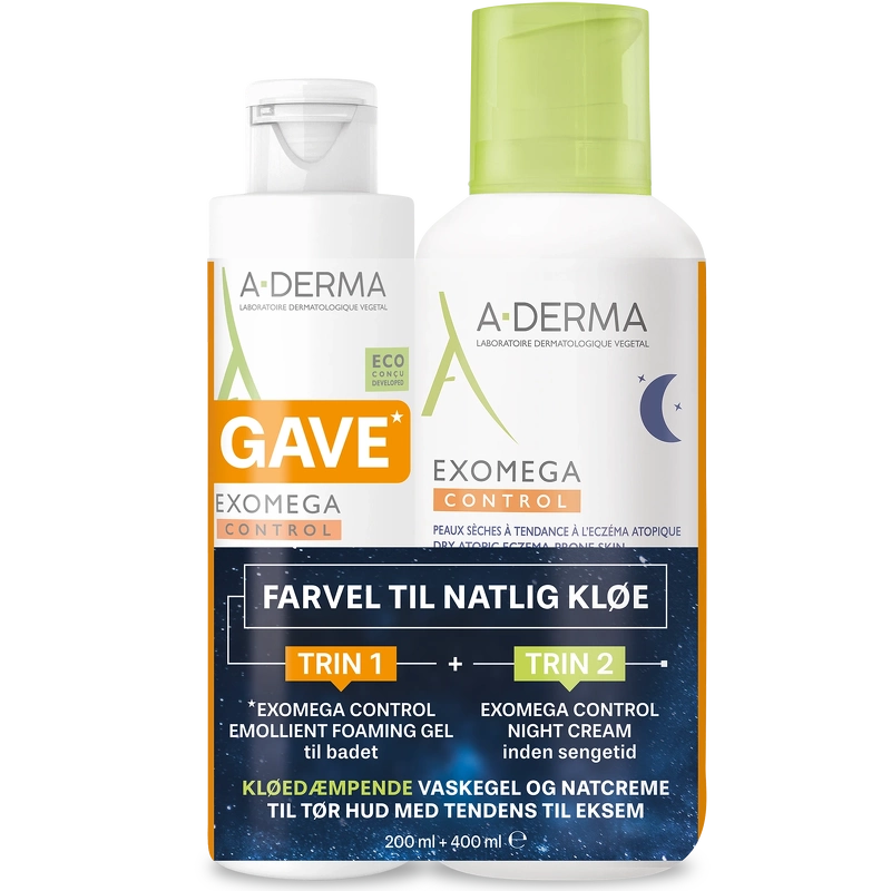 A-DERMA Exomega Night Kit er et sæt med Exomega Control vaskegel og night cream, som er udviklet til at give dig en rolig nat uden kløe.