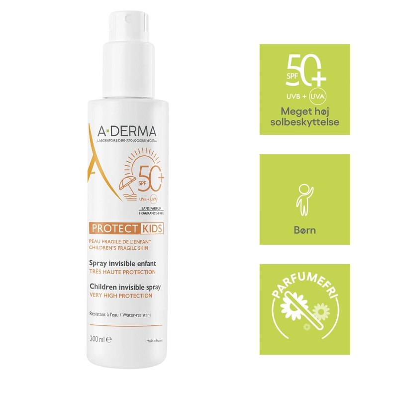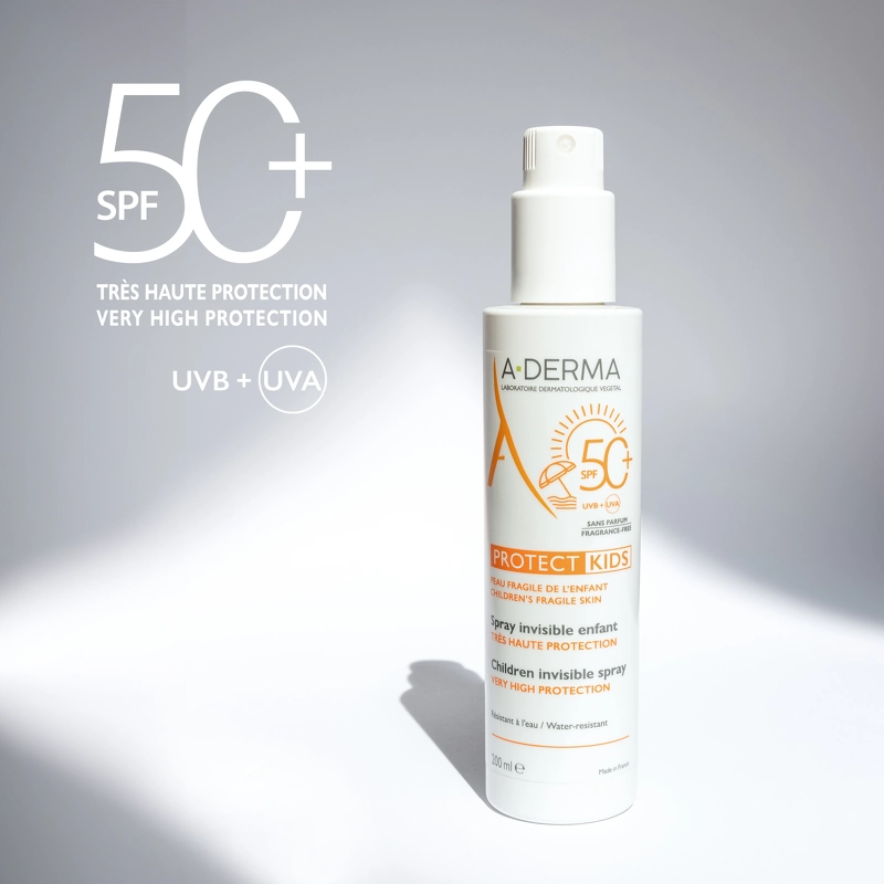 A-DERMA Protect Kids Spray SPF 50+ er en effektiv og vandfast solcreme på spray, som er udviklet specielt til sart hud hos børn. Den kan anvendes både i ansigtet og på kroppen, hvor den giver huden meget høj beskyttelse mod solens korte og lange UVA-stråler, samt UVB-stråler, takket være stabile, bredspektrede og miljøvenlige solfiltre.