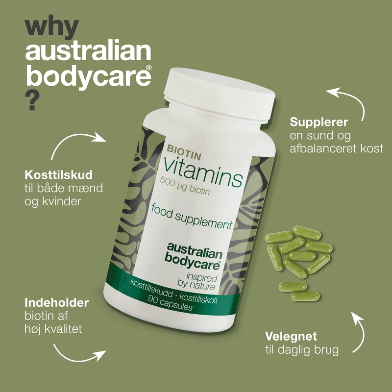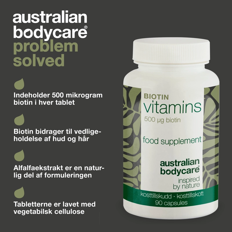 Australian Bodycare BIOTIN 90 Pieces er et biotin kosttilskud. Ønsker du et enkelt og overskueligt tilskud af biotin (også kendt som B7-vitamin), så får du her 90 små tabletter med biotin – klar til at indgå som en del af din daglige rutine.