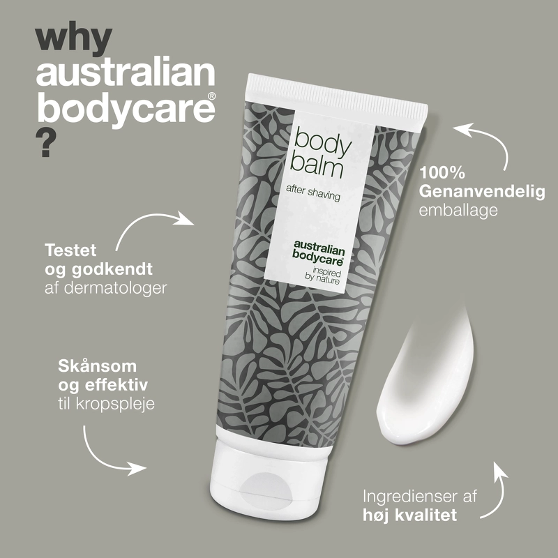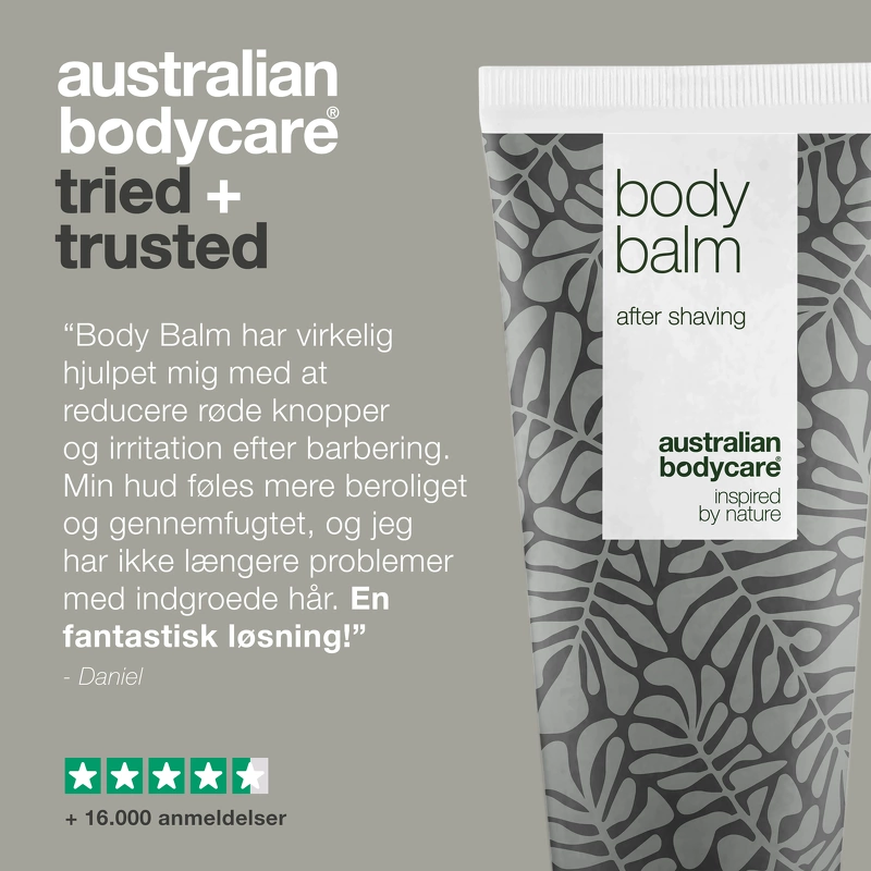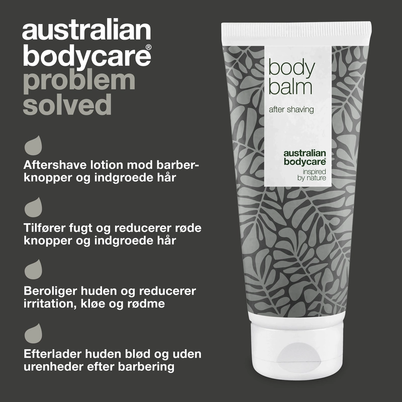 Australian Bodycare Body Balm er en creme, som er specielt udviklet til brug efter barbering. Denne creme virker plejende og fugtgivende, og vil modvirke knopper eller indgroede hår, som ofte kan opstå efter barbering. Den er selvfølgelig med naturlig, australsk Tea Tree Oil, som har en antibakteriel virkning, og som derved modvirker bakterier og i stedet holder huden sund. Derudover er den med tasmansk peber, som virker beroligende, og som modvirker irritation, mens allantoin har en lindrende virkning på skadet hud. Cremen kan både bruges efter intimbarbering, og ved hårfjerning eller barbering under armene og på benene. Ved brug af Australian Bodycare Body Balm vil du opleve at får en hud, som er blød og velplejet.