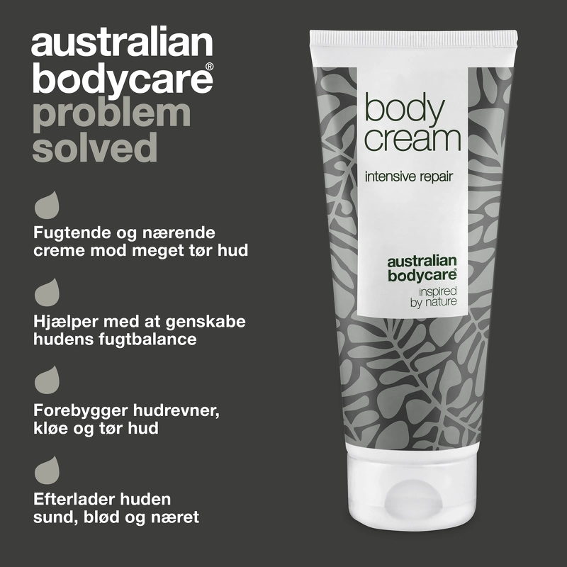 Australian Bodycare Body Cream er en plejende creme, som er specielt udviklet til tør hud på kroppen. Cremen forebygger hudproblemer, og opretholder hudens fugtighedsbalance. På grund af indholdet af naturlig, australsk Tea Tree Oil, modvirker den bakterier, og forhindrer at de sætter sig på huden, og derved hjælper det huden til at hele hurtigere. Derudover er den med troldnød, som lukker hudens porer, og som beskytter huden mod udtørring. Allantoin lindrer skadet hud og mindsker irritation. Cremen er utroligt blødgørende, og er god til f.eks. tørre albuer eller fødder, og derudover er mange glade for at bruge den som håndcreme.