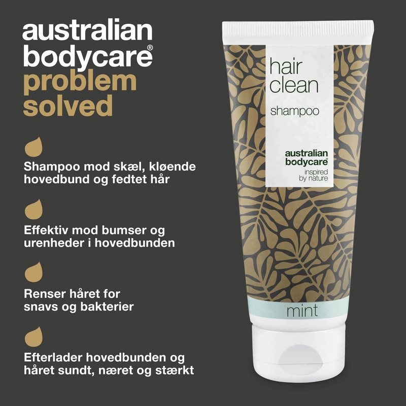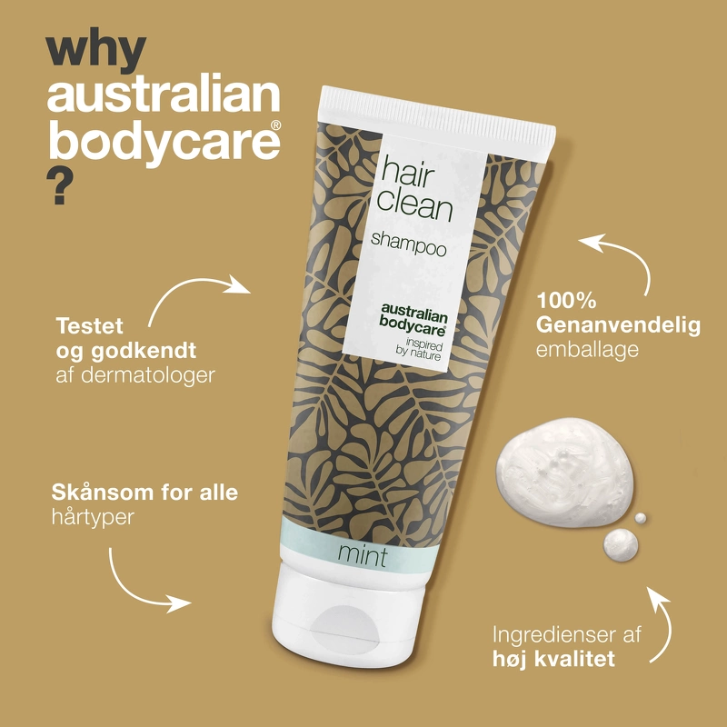 Australian Bodycare Hair Clean Shampoo Mint er en dybderensende shampoo, som kan bruges af hele familien og til alle hår- og hudtyper til vask og pleje af både hår, hovedbund og skæg. Den er særlig velegnet, hvis du døjer med skæl, fedtet hår og hovedbund, har tendens til bumser og urenheder i hovedbunden eller har en irriteret og tør hovedbund.