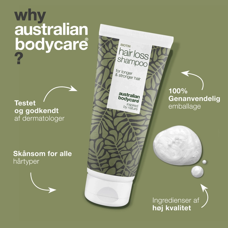 Australian Bodycare Hair Loss Wash indeholder nemlig det naturligt aktive Capilia Longa og Biotin, som er bevist effektive ved hårtab. Den er desuden tilsat naturlig Tea Tree Oil, som modvirker bakterier og fremmer en sundere hovedbund. Samtidig sørger Amaranthekstrakt for at holde både hår og hovedbund velhydreret.