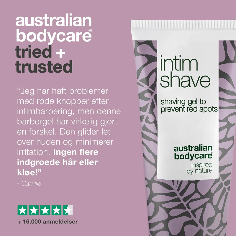 Australian Bodycare Intim Shave er en klar barbergel, som bruges i intimområdet. Mange døjer med at få indgroede hår, rødme, knopper eller andre gener ved intimbarbering, og har man først prøvet det én gang, så ved man hvor ubehageligt det kan være. Ved at starte med at fjerne bakterier fra huden, derefter barbere sig og til slut komme et beroligende produkt på det barberede område, minimeres risikoen markant for at få gener efterfølgende.