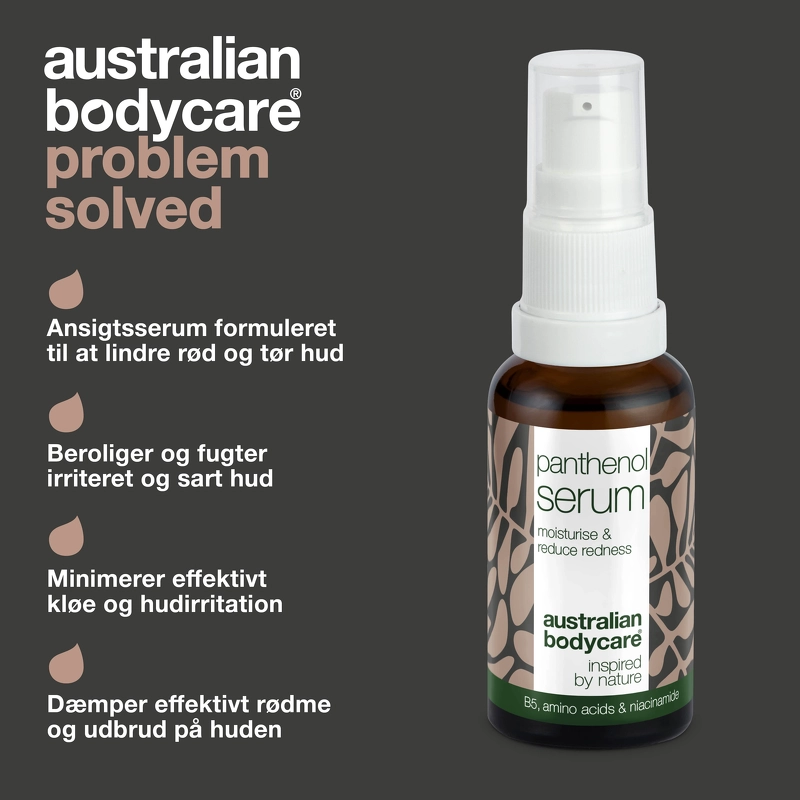 Australian Bodycare Panthenol Serum er et serum, som er utrolig god til meget tør og irriteret hud. Nøgleingrediensen i dette fantastiske serum er panthenol, der har en utrolig beroligende effekt, og minimerer rødme, irritation og ujævnheder. Derudover er formlen også beriget med hyaluronsyre, der holder fugten i huden, hvilket modvirker tørhed og kløe.