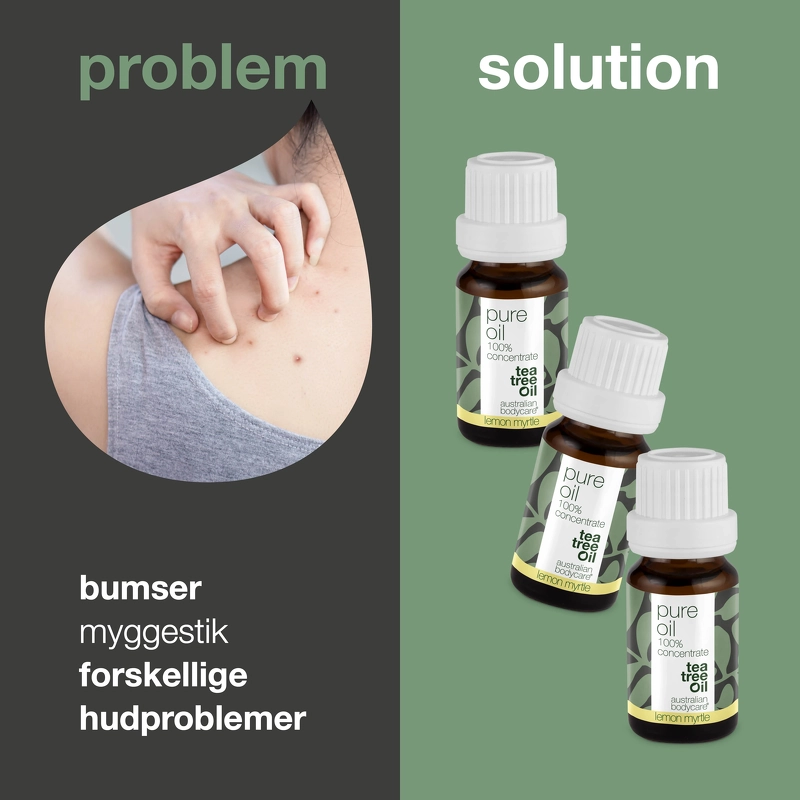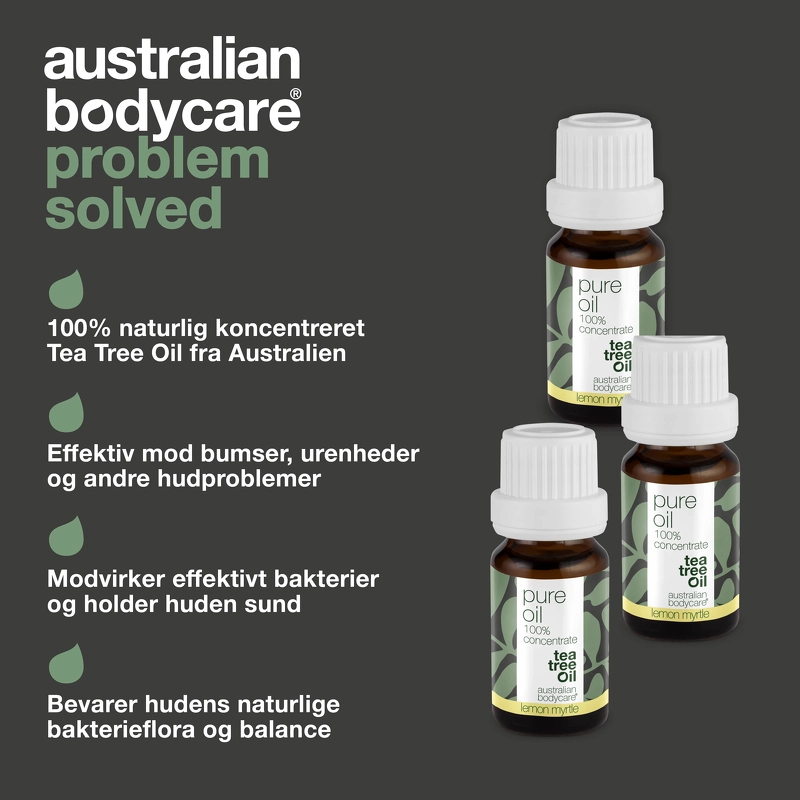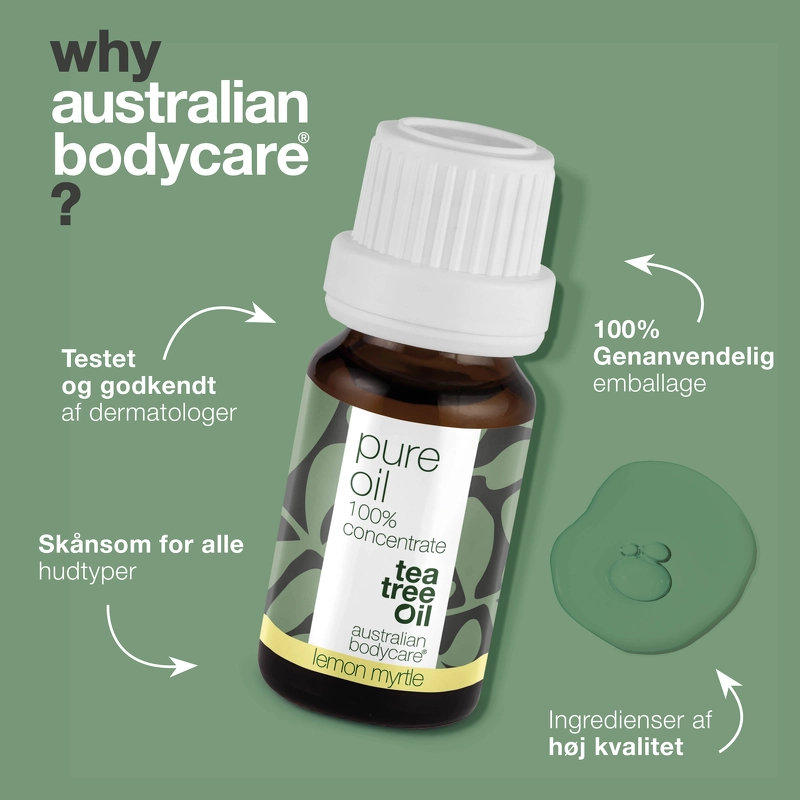 Australian Bodycare Pure Oil Lemon Myrtle er en koncentreret olie, som modvirker bakterier. Australsk Tea Tree Oil har været kendt i århundrede for sine antibakterielle egenskaber, og har været brugt mod hudinfektioner i australsk folkemedicin i mere end 1000 år. Olien forebygger hudproblemer, og er med til at holde huden ren og sund. Den har en helende effekt på hud, som er skadet på den ene eller anden måde, og er især god at bruge på urenheder, insektstik eller irritation, da den både virker antiseptisk og kløestillende. Denne variant er også tilsat lemon myrtle, som giver en skøn, forfriskende citrusduft.