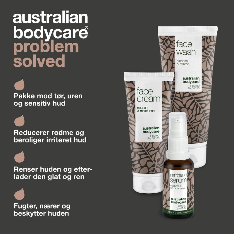 Ansigtscremen holder ansigtshuden beskyttet og velplejet. Indholdet af naturlig og australsk Tea Tree Oil har kløestillende effekt på irriteret hud, mens indholdet af E-vitamin sikrer hudens smidighed.