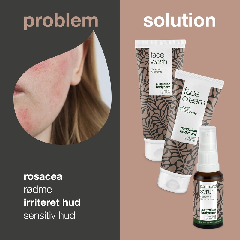 Australian Bodycare Redness Relief Kit er en sampak med 3 produkter til dig med følsom hud, som kan udmønte sig i rødme, kløe eller anden hudirritation. Rødme kan skyldes flere forskellige ting, men uanset årsagen virker produkterne i pakken beroligende på sensitiv og irriteret hud. Produkterne kan også bruges til daglig pleje ved rosacea.