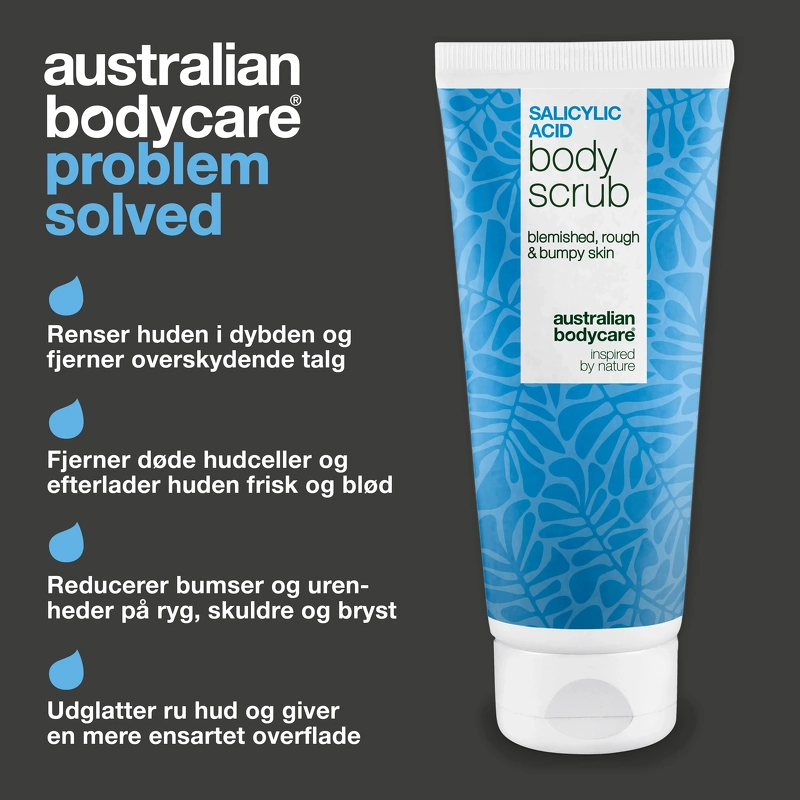 Australian Bodycare Salicylic Acid Body Scrub er en dybdegående eksfoliering til uren, fedtet og ujævn hud Den er udviklet til dig, der oplever tilstoppede porer, knopper og ujævn hudstruktur på kroppen – især på ryg, skuldre, arme, baller eller lår. Den kombinerer mekanisk og kemisk eksfoliering for at fjerne døde hudceller, overskydende talg og urenheder, så huden efterlades glattere, blødere og mere ensartet.