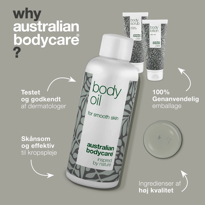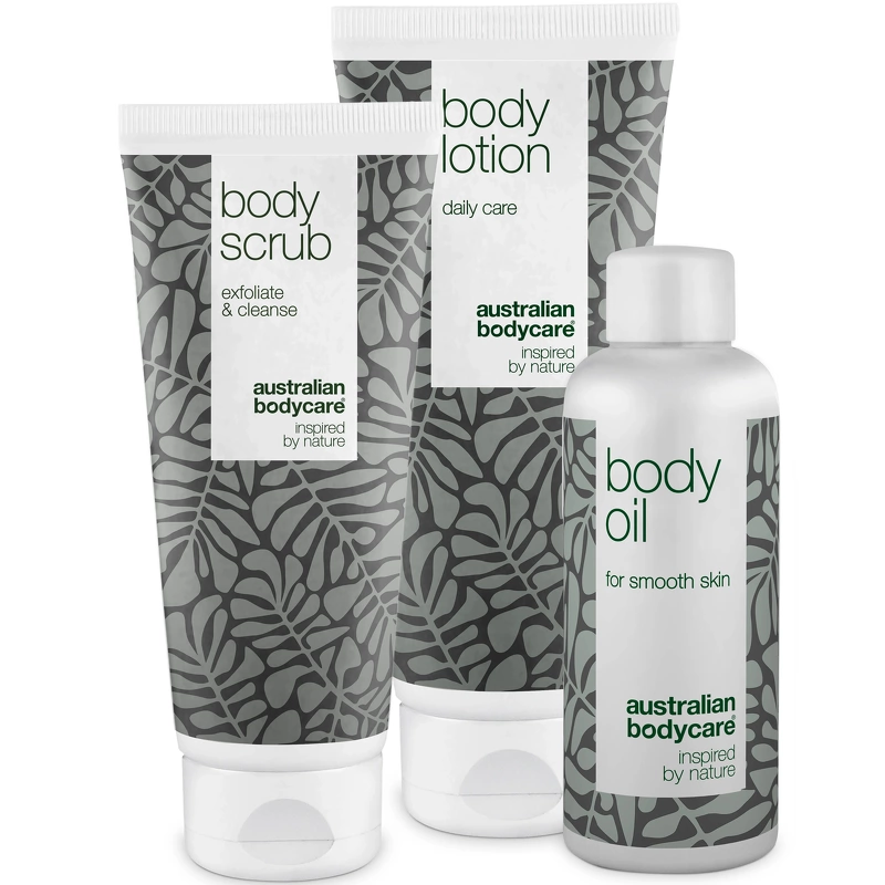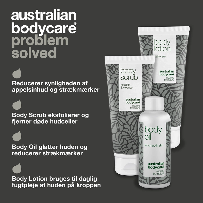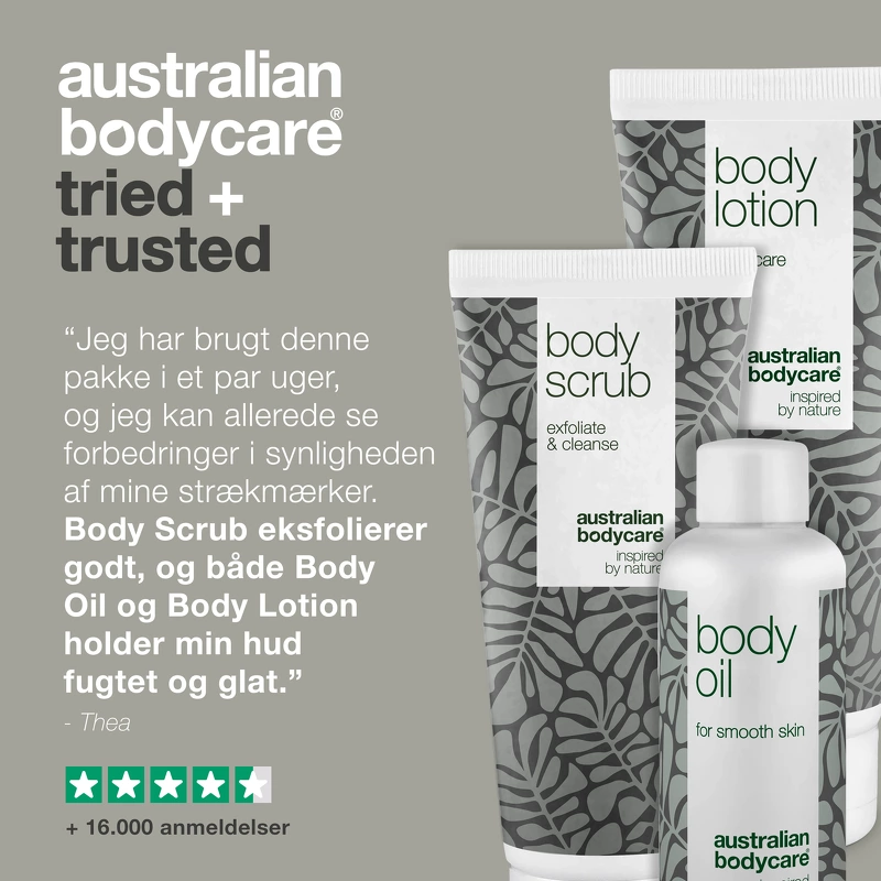 Australian Bodycare Stretch Mark Care Kit består af en scrub, lotion og olie til kroppen, som både eksfolierer, fugter og blødgør huden. Dette er med til at fugtmætte huden og forbedre dens generelle udseende, som igen vil gøre, at strækmærker og ar fremstår mindre synlige.