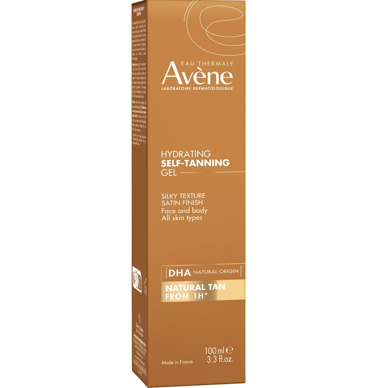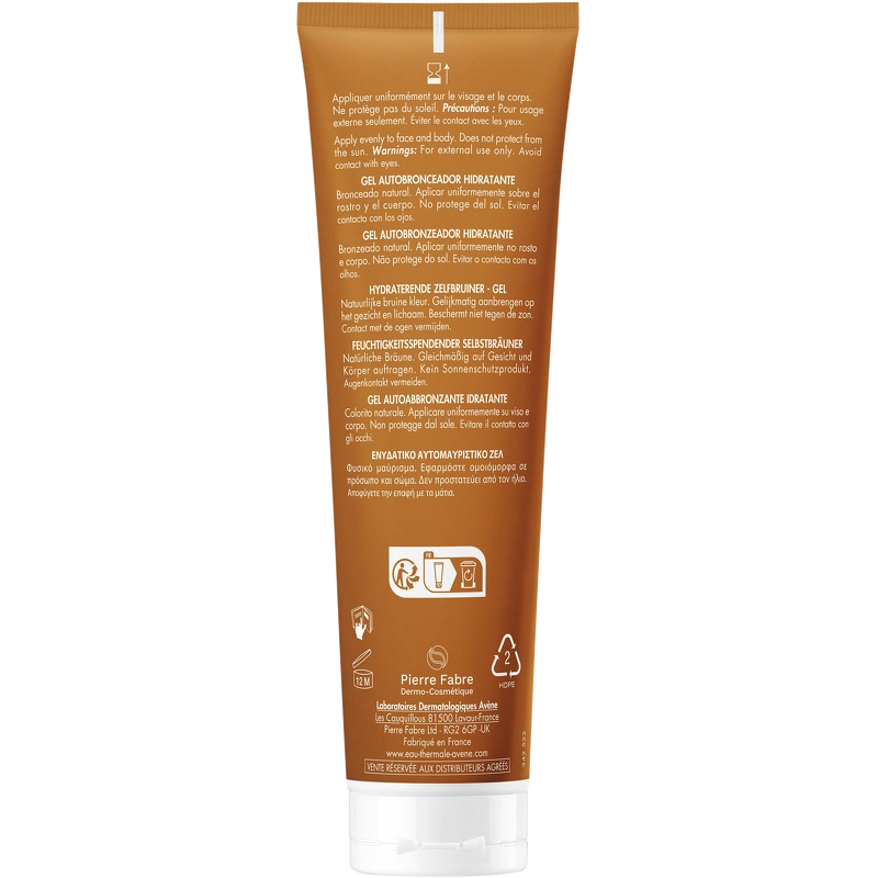 Formuleringen er beriget med DHA (dihydroxyacetone) af naturlig oprindelse, som gradvist opbygger en naturlig og strålende kulør. Avène Termalkildevand, glycerin og provitamin E plejer huden og efterlader den blød og komfortabel.