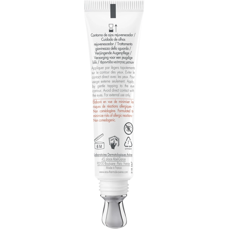 Øjencremen indeholder også dextransulfat, som sammen med den kølende metalapplikator, reducerer hævelser og mørke rande, for at give øjnene et mere friskt og veloplagt udtryk. Derudover er den fri for parfume og tilsat Avènes Termalkildevand med beroligende og blødgørende egenskaber, som er god til sensitiv hud.