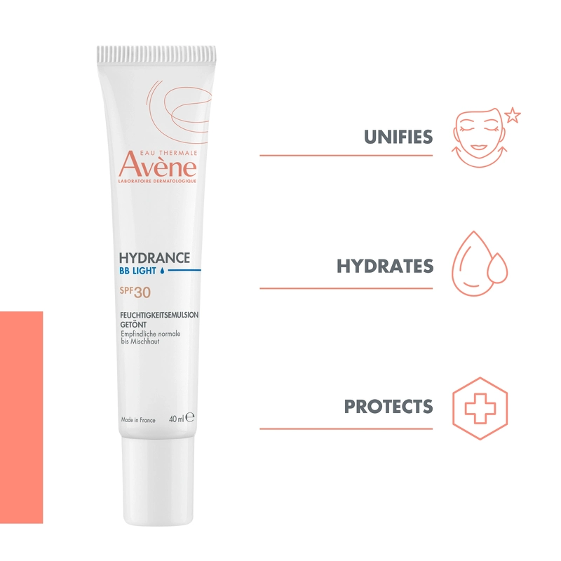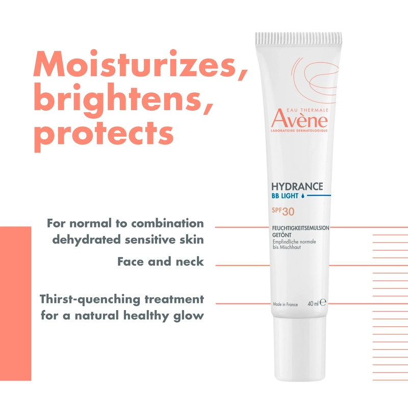 Avène Hydrance BB Light Tinted Hydrating Cream SPF 30 er en let farvet og yderst fugtgivende dagcreme, som er udviklet specielt til dehydreret, sensitiv hud hos en normal/kombineret hudtype.