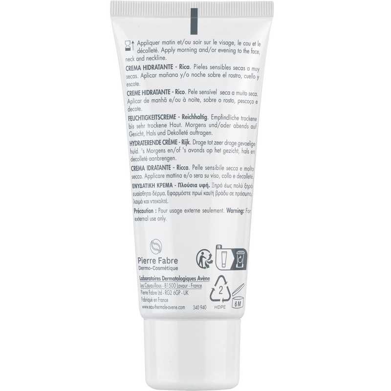 Denne creme er beriget med et patenteret fugtgivende kompleks, kaldet Cohederm, der fungerer som vanddepoter i huden, og sikrer intensiv fugttilførsel over 24 timer, samtidig med at fordampningen fra huden reduceres. Den indeholder også Avène Termalkildevand, som virker opfriskende og bidrager med beroligende og genopbyggende egenskaber.