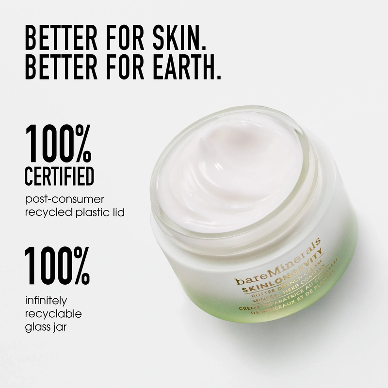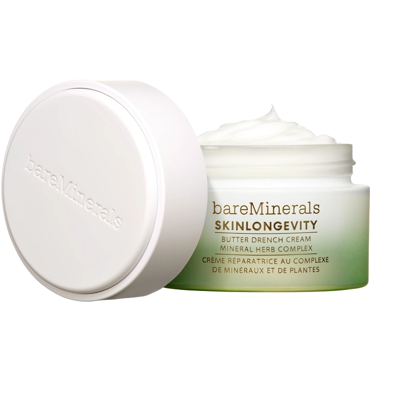 bareMinerals Skinlongevity Butter Drench Cream er en rig og nærende ansigtscreme, der giver huden intensiv fugt og langvarig komfort, samtidig med at hudbarrieren styrkes og huden bliver blødere, glattere og mere smidig. bareMinerals Skinlongevity Butter Drench Cream kombinerer det innovative Mineral Herb Complex med plejende sheasmør og ceramider, som arbejder sammen for at genopbygge fugtbalancen og beskytte huden mod udtørring og ydre påvirkninger.