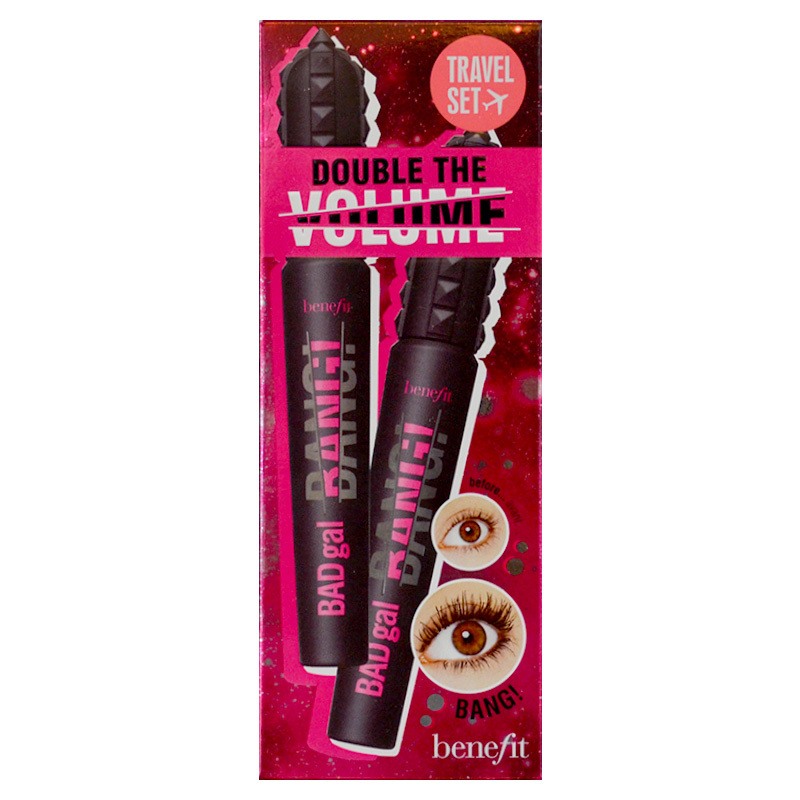 Benefit BADgal Bang Volumizing Mascara - Black (Limited Edition) er en lækker æske der indeholder 2 af disse skønne mascaraer. Benefit BADgal Bang Volumizing Mascara er en intens, dramatisk og vandfast mascara, der giver voluminøse, fyldige og opsigtvækkende vipper. Denne mascara er beriget med aeropartikler, som er et af de letteste materialer der findes, og som sikrer at selvom du påfører flere lag, så tyngder det ikke dine vipper, tværtimod! Den specialdesignede mascarabørste har en sådan særlig form at den fanger dine vipper og påfører mascara hele vejen fra vippernes rod til spidserne, samt fra øjenkrog til øjenkrog. Tilmed indeholder den B5-vitamin er styrker vipperne så du kan få et endnu fyldigere resultat. En fantastisk og langtidsholdbar mascara der rammer dine øjne ind på den vildeste måde, og giver et næsten false-lash look.