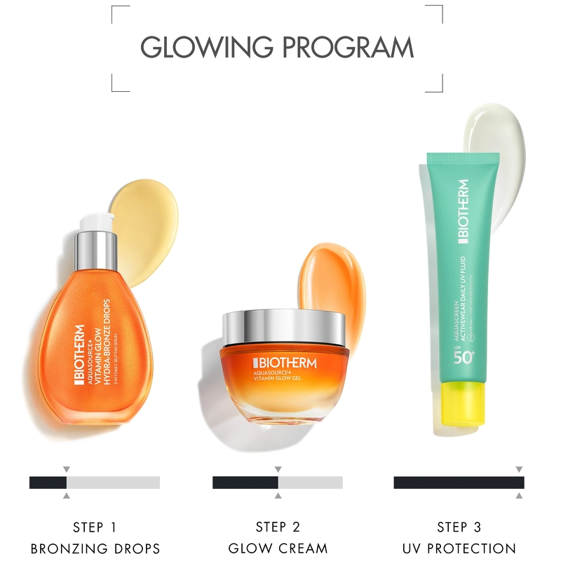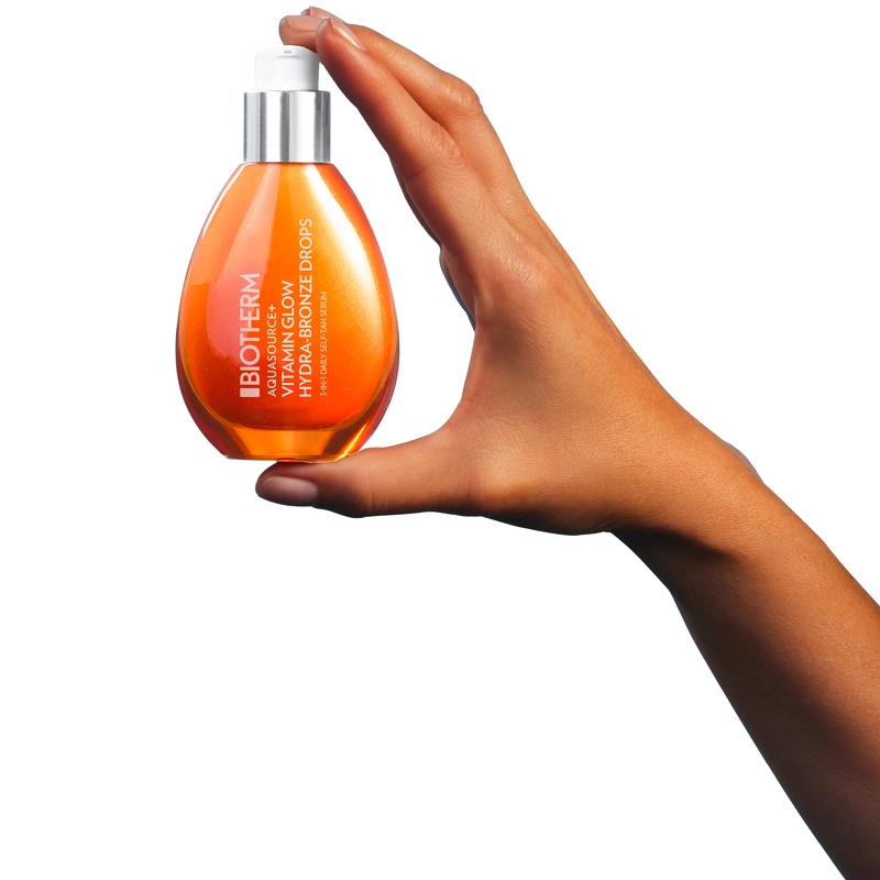 Biotherm Aquasource+ Vitamin Glow Hydra-Bronze Drops er et 3-i-1 selvbruner-serum, der giver øjeblikkelig glød, intens fugt og en gradvist solkysset hud på blot fire timer. Aquasource+ Vitamin Glow Hydra-Bronze Drops kombinerer hudpleje og skønhed i ét produkt, så du får et naturligt solbrunt look uden at gå på kompromis med hudens glød og fugt.