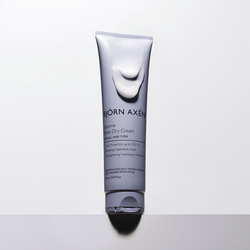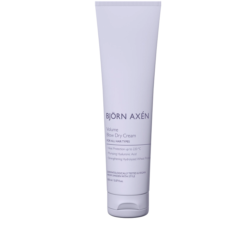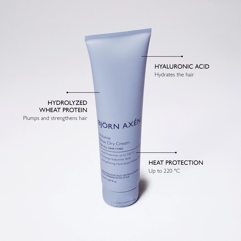 Björn Axén Volume Blow Dry Cream er en stylingcreme, der tilfører håret fugt og giver det volumen og hold, samtidig med at den beskytter mod varmen fra føntørring. Beriget med Hyaluronsyre og Hydrolyseret Hvedeprotein for at give håret fylde, fugt og styrke. Efterlader håret spændstigt og fyldigt.
