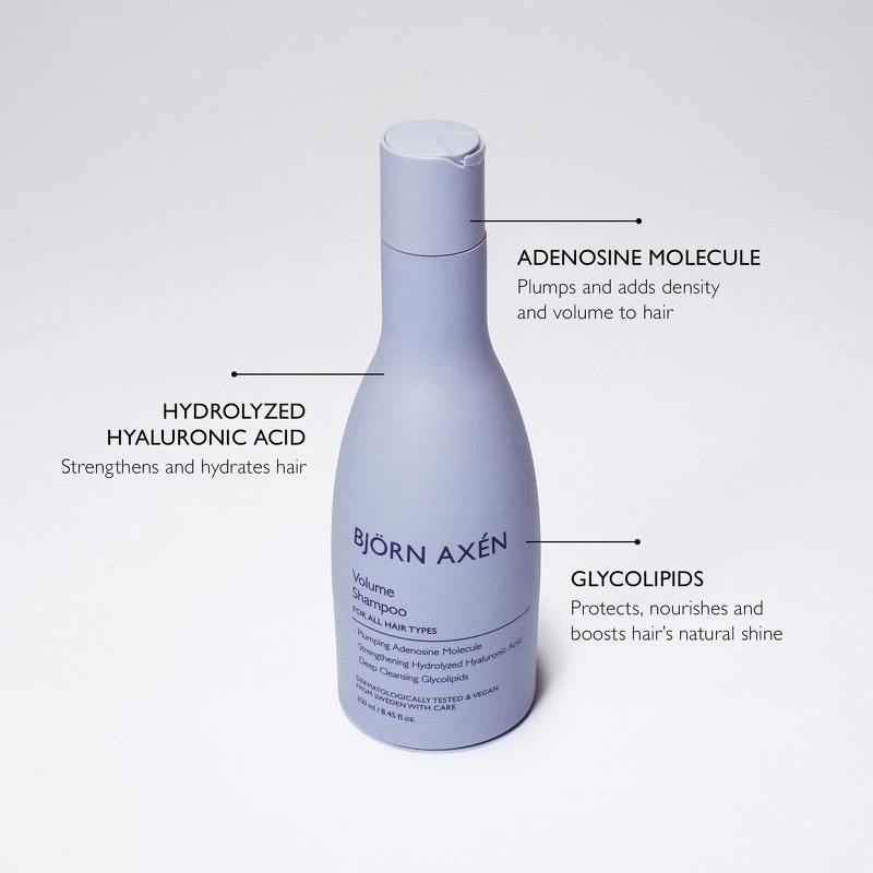Björn Axén Volume Shampoo er en let shampoo, der giver håret volumen uden at gøre det tungt. Beriget med Adenosinmolekyle og Hydrolyseret Hyaluronsyre for at give håret fylde og styrke og Glykolipider for at afbalancere olieproduktionen i hovedbunden. Shampooen efterlader håret friskt, luftigt og fyldigt.