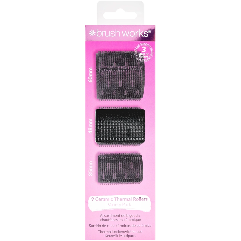 Brushworks Ceramic Thermal Rollers Variety Pack er en pakke med 9 keramiske velcro-rollere i tre størrelser for langtidsholdbare, fyldige krøller.