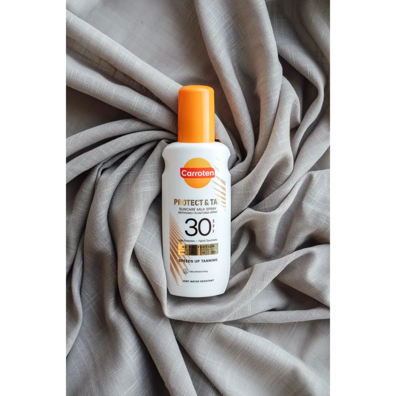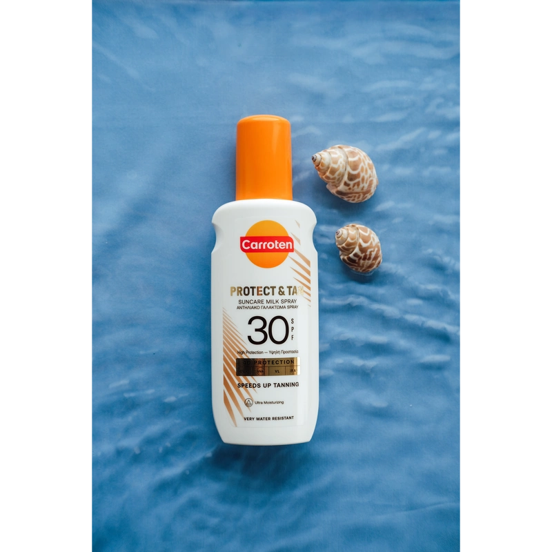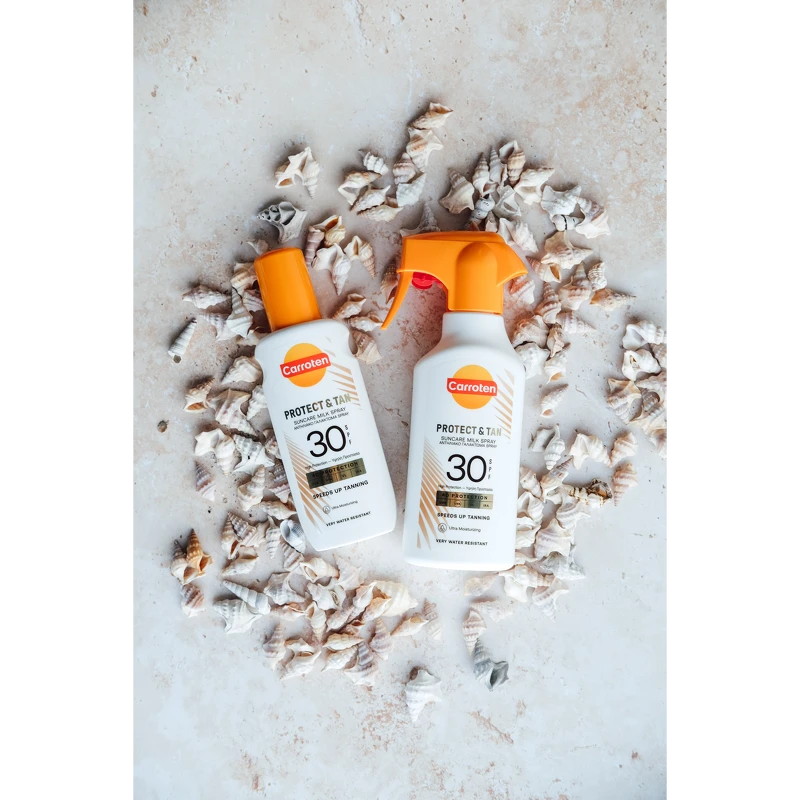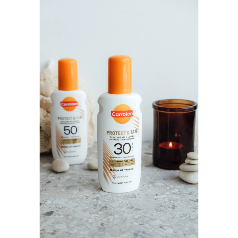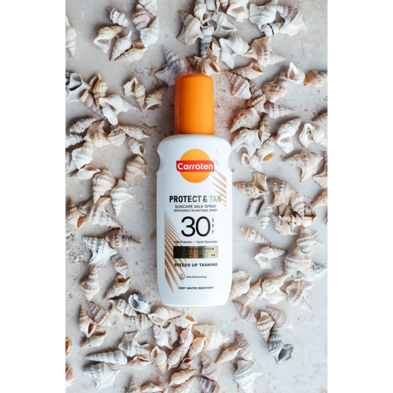 Carroten Protect & Tan Milk Spray SPF 30 er en solcreme, som beskytter effektivt huden og fremmer samtidig en smuk, gylden glød. Den innovative triple-action tan booster hjælper med at stimulere hudens naturlige bruningsproces, intensivere farven og bidrage til en mere langtidsholdbar tan. Samtidig giver den avancerede formel 4D-beskyttelse mod UVB-, UVA-, VL- og IRA-stråler, så huden er beskyttet under soleksponering.
