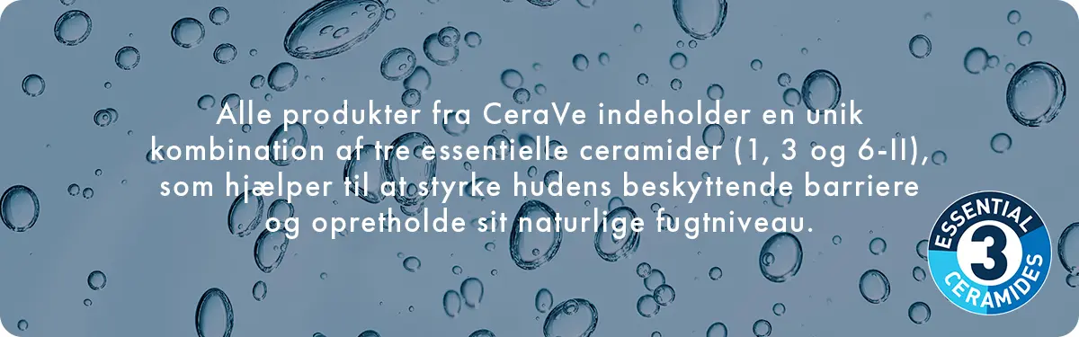 Alle CeraVes produkter indeholder en blanding af tre essentielle ceramider (1, 3 og 6-II), der kombineret med andre ingredienser såsom hyaluronsyre, fedtsyrer og andre lipider hjælper med at styrke hudens naturlige barriere. Deres unikke MVE-Teknologi er med til kontinuerligt at frigive de aktive ingredienser, så du får vedvarende fugt, mens du bruger produkterne.
