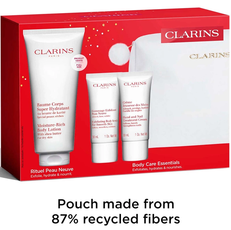 For at fjerne døde hudceller, brug Exfoliating Body Scrub for Smooth Skin med bambuspulver en gang om ugen. Blød, strålende hud starter med eksfoliering, det er det første skridt i enhver effektiv skønhedsrutine. Afslut med den ikoniske Hand and Nail Treatment Cream, en Clarins-favorit, der ikke kun fugter og blødgør hænderne, men også styrker neglene. En smuk pouch lavet af 87% genanvendte fibre opbevarer alle produkterne. Den genanvendelige æske er trykt på papir fra bæredygtigt forvaltede skove.