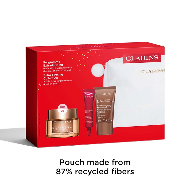 Fuldfør din hudplejerutine med Extra-Firming Night Cream, som virker i de timer, hvor hudens fornyelse er mest aktiv. Og for et fastere øjenområde hjælper den nye Total Eye Lift med at afsløre ungdommeligt strålende øjne. Kombinér denne rutine med det ikoniske ny-generation Double Serum, en komplet behandling, der målretter tegn på aldring. En smuk pung lavet af 87% genanvendte fibre opbevarer alle produkterne. Den genanvendelige æske er trykt på papir fra bæredygtigt forvaltede skove.