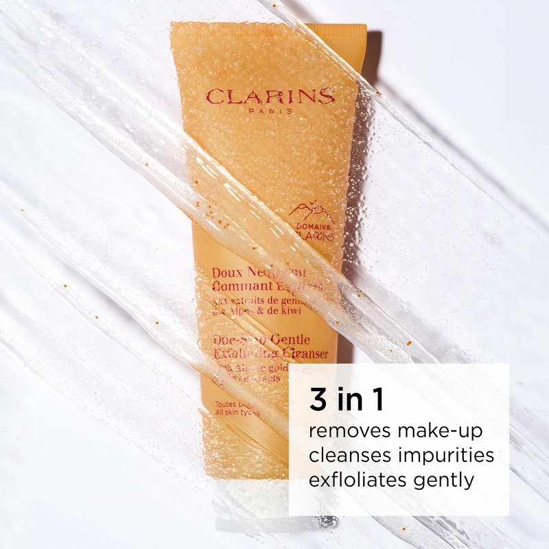 Clarins One-Step Gentle Exfoliating Cleanser er en 3-i-1 rens der fjerner makeup, renser og eksfolierer alle hudtyper i et enkelt trin og bevarer samtidig hudens balance.