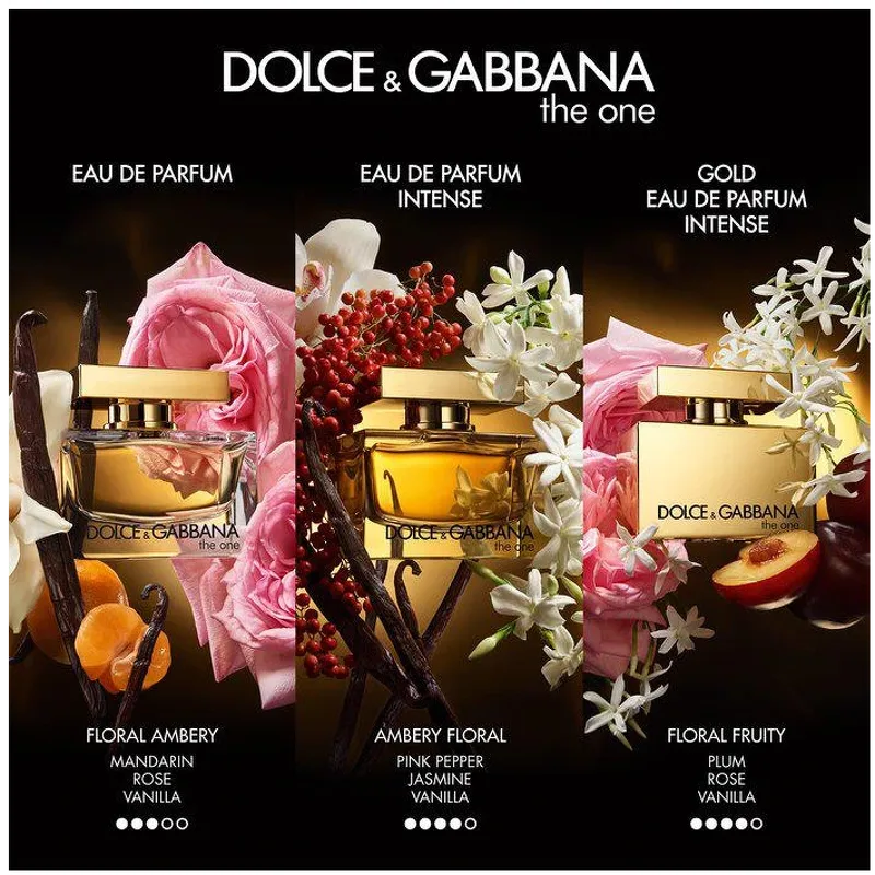Flaskens design nyfortolker de karakteristiske linjer fra den originale The One og lader den varme, ravfarvede duft træde tydeligt frem. The One Eau de Parfum Intense er en hyldest til den moderne kvinde – selvsikker, fængslende og uimodståeligt karismatisk. Duften er skabt eksklusivt for Dolce & Gabbana af parfumør Quentin Bisch.