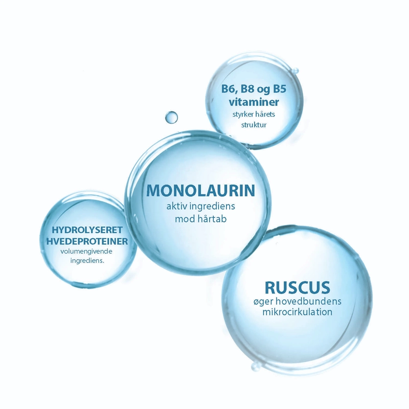 Et vitaminkompleks med bl.a. Biotin, tilfører den essentielle næring, som er afgørende for væksten af stærkt hår. Den aktive ingrediens Ruscus hjælper med at stimulere mirkocirkulationen i hovedbunden, hydrolyseret hvedeprotein giver mere volumen, mens Monolaurin bremser hårtab ved at påvirke det enzym, som er den primære årsag til problemet.