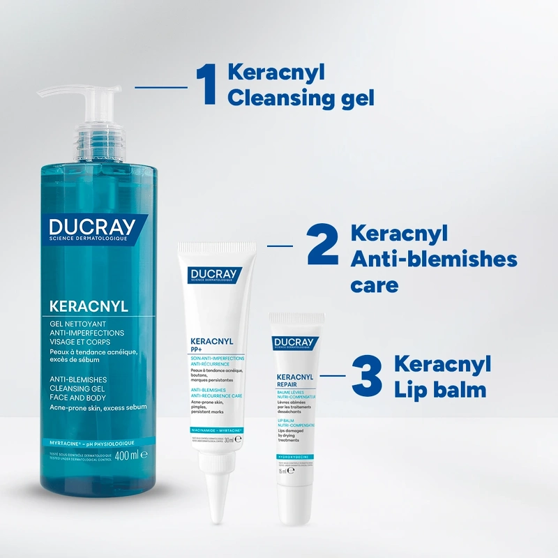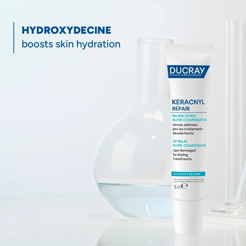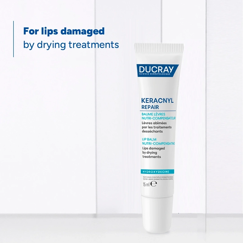 DUCRAY Keracnyl Repair Lip Balm er en læbebalm til læber, der er udtørrede på grund af medicinske tabletbehandlinger mod svær akne. Den plejer, reparerer og beskytter tørre, sprukne læber for at kompensere for bivirkningerne af disse behandlinger.