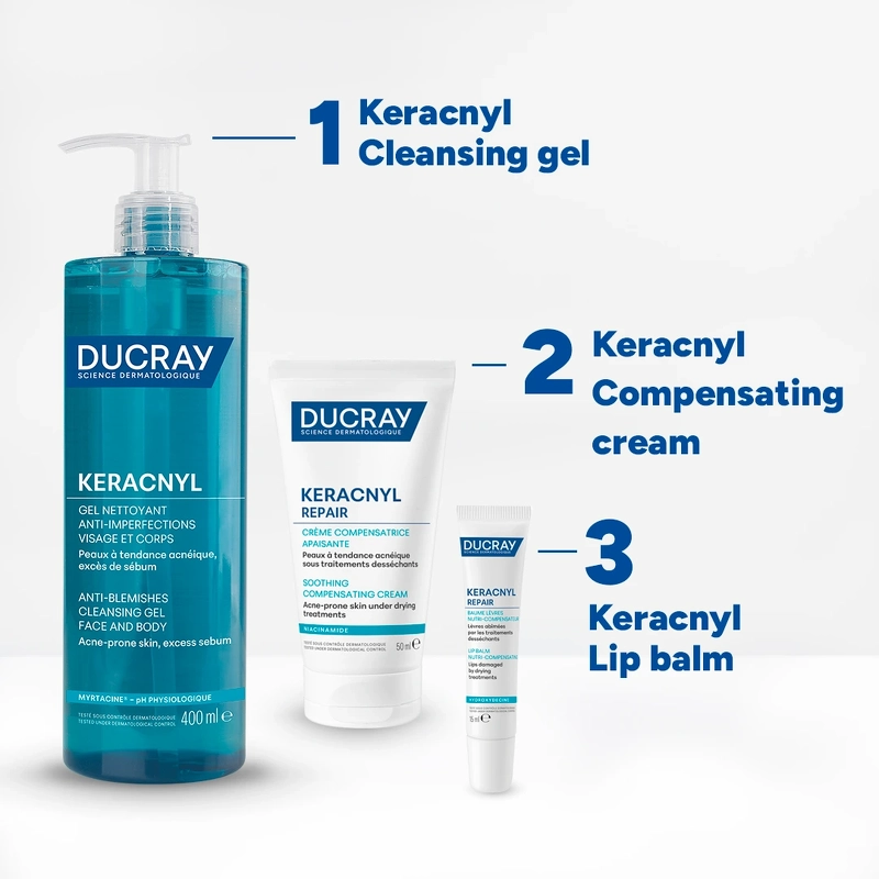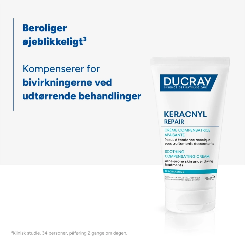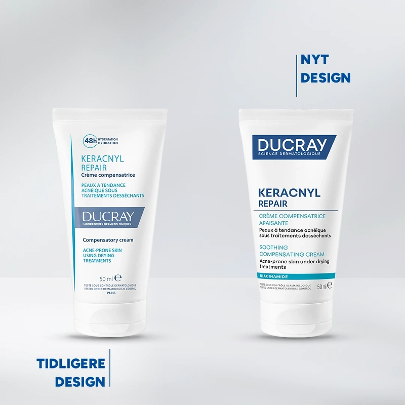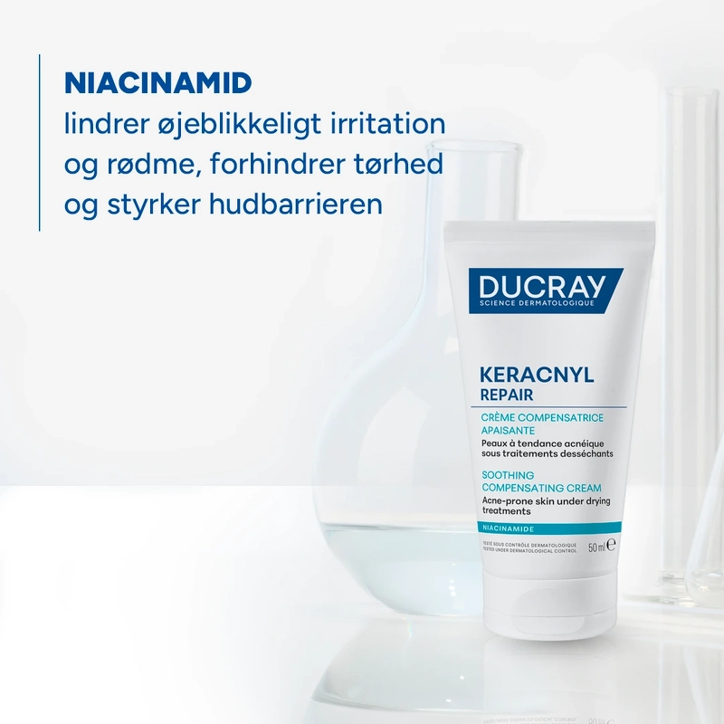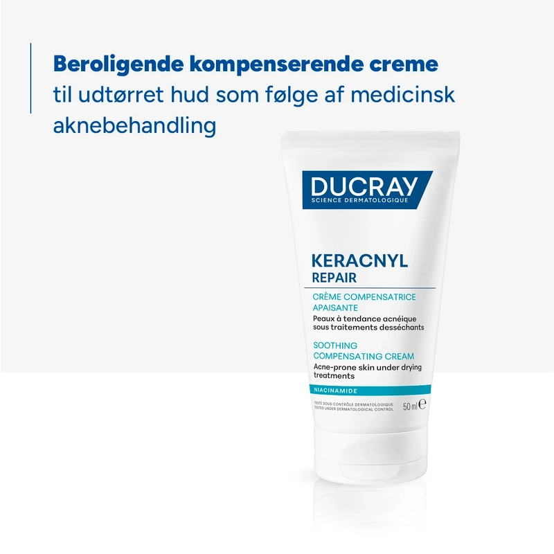 DUCRAY Keracnyl Repair Soothing Compensating Cream er en beroligende, fugtgivende og reparerende ansigtscreme til hud, der er svækket af udtørrende medicinske tabletbehandlinger mod svær akne. Den har både fugtgivende, beroligende og reparerende egenskaber, som hjælper med at kompensere for bivirkningerne af disse behandlinger.