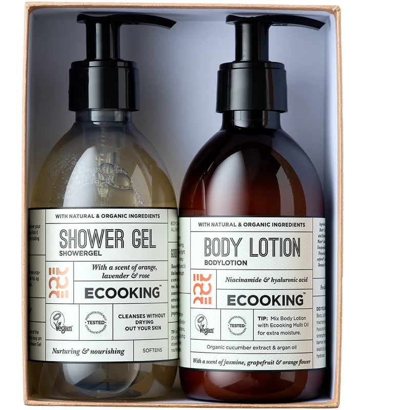 Ecooking Bodycare Set - Cardboard Box er en eksklusiv gaveæske, der efterlader huden silkeblød og velplejet fra top til tå. Den skånsomme shower gel renser huden nænsomt og giver en frisk fornemmelse, mens den plejende body lotion trænger hurtigt ind og tilfører intensiv fugt, så huden føles smidig og glat hele dagen. Sammen skaber de en luksuriøs oplevelse af velvære, der gør den daglige hudpleje til et øjeblik af ren forkælelse.
