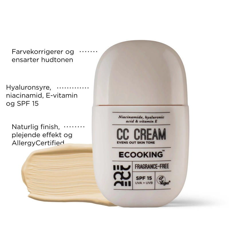 Ecooking CC Cream 30 ml - 02 Light er eksperten i at ensarte hudtonen og nedtone ujævnheder. Denne plejende og dækkende creme er specialiseret i at korrigere rødme og pigmentpletter, så din hud syner mere jævn. CC Cream kan også erstatte din dagcreme, da den er fyldt med fugtgivende hyaluronsyre og E-vitamin samt udglattende niacinamid.
