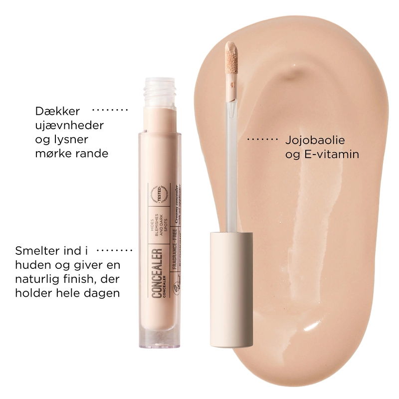 Concealeren er et cremet miks af E-vitamin og jojobaolie, som kombinerer makeup og hudpleje for at beskytte, berolige og fugte din hud, mens den effektivt skjuler ujævnheder. Dens lette konsistens smelter ind i huden uden at lægge sig i fine linjer for et naturligt og holdbart resultat.