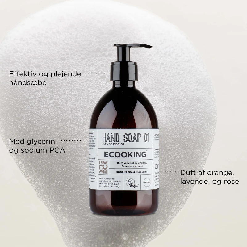 Ecooking Hand Soap er en håndsæbe der renser uden at udtørre dine hænder, fordi den er lavet med plejende sodium PCA og glycerin, der fugter og blødgør huden.