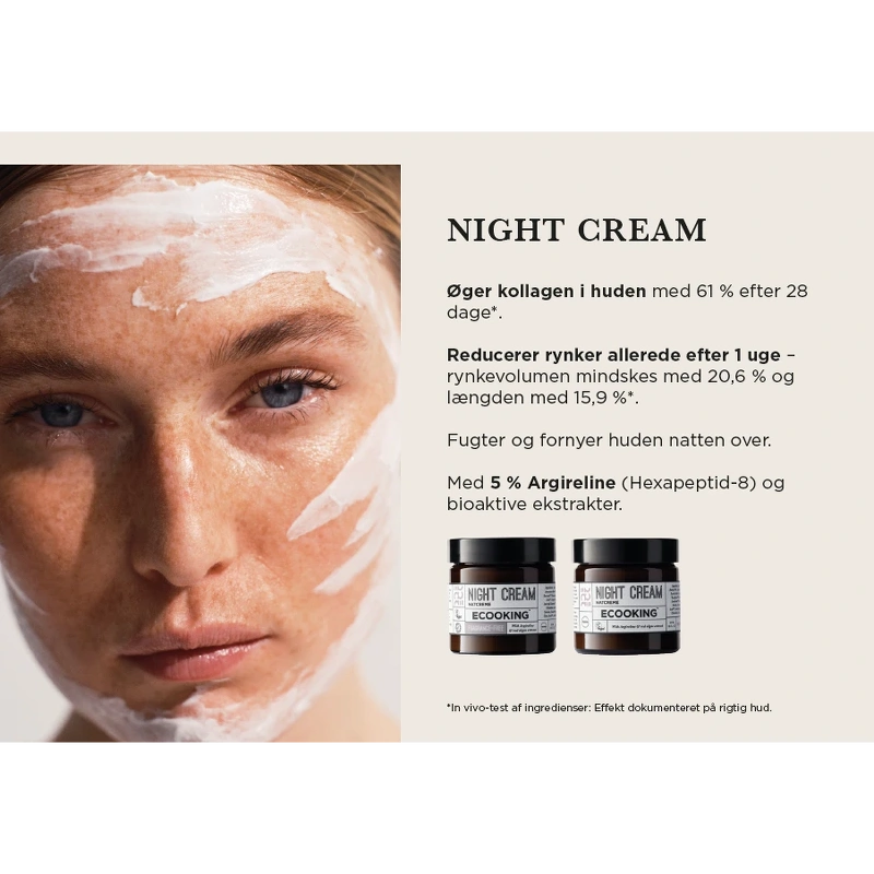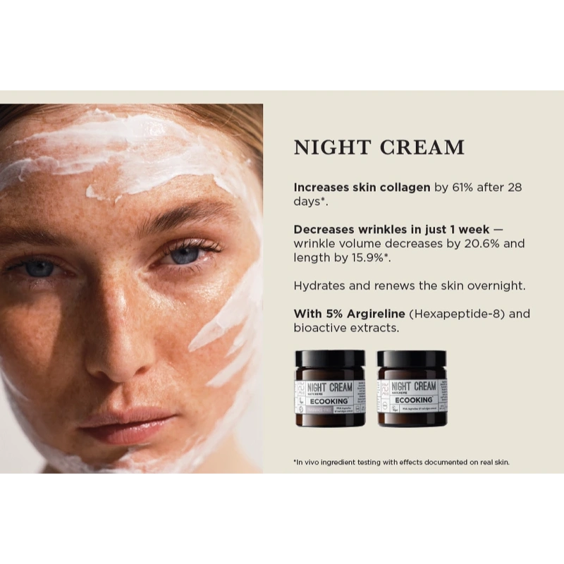Ecooking Night Cream Fragrance Free er en lækker natcreme, som får din hud glæde af naturlige, mineralrige ekstrakter fra græskar og rødalger samt Argireline med botox-egenskaber.