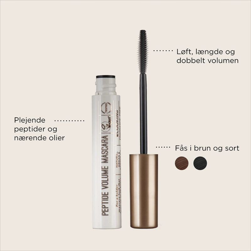 Ecooking Peptide Volume Mascara - Brown er den perfekte mascara til dig, der gerne vil have lidt mere af det hele - i en blød brun farve for et mere naturligt look. Mere længde. Mere løft. Mere volumen.