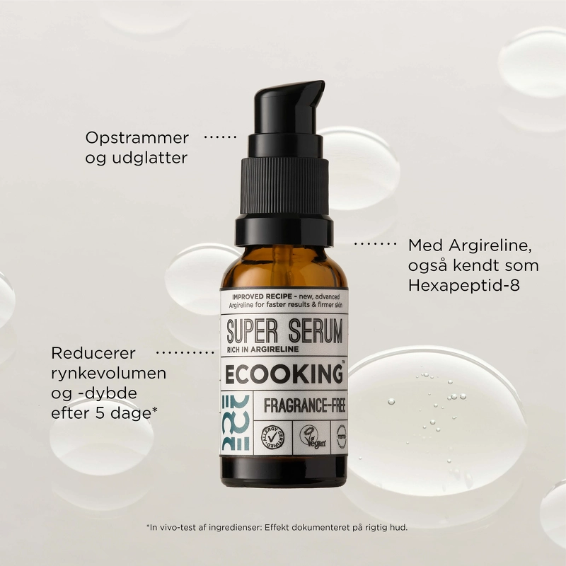 Ecooking Super Serum er et opstrammende og fugtgivende serum med stjerneingrediensen Argireline – et peptid, der effektivt øger hudens fasthed og giver et synligt løft. Det var blandt de første syv ECOOKING-produkter, som Tina Søgaard udviklede i sit køkken for at give huden et boost.