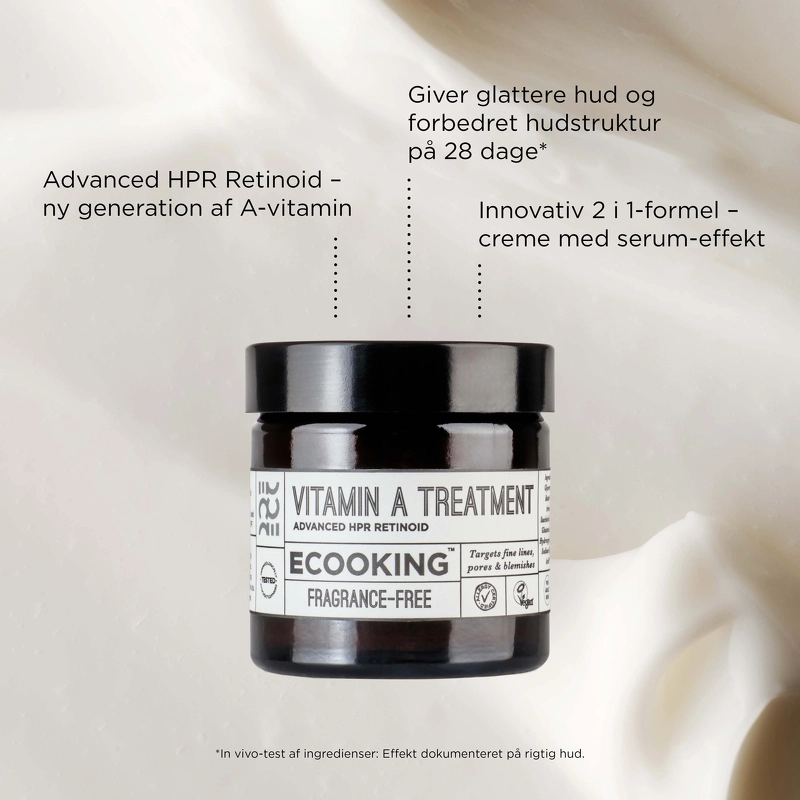 A-vitamin er noget alle hudtyper bør opleve. Og nu er det også muligt for de sensitive! ECOOKINGs Vitamin A Treatment Fragrance-free gør alt, du forventer af en A-vitamin-creme, men med mindst mulig risiko for irritation. Kort sagt bliver din hud friskere, glattere og mere ensartet med Vitamin A Treatment allerede efter fire ugers brug. Den hjælper også effektivt mod urenheder, synlige porer og solpletter.