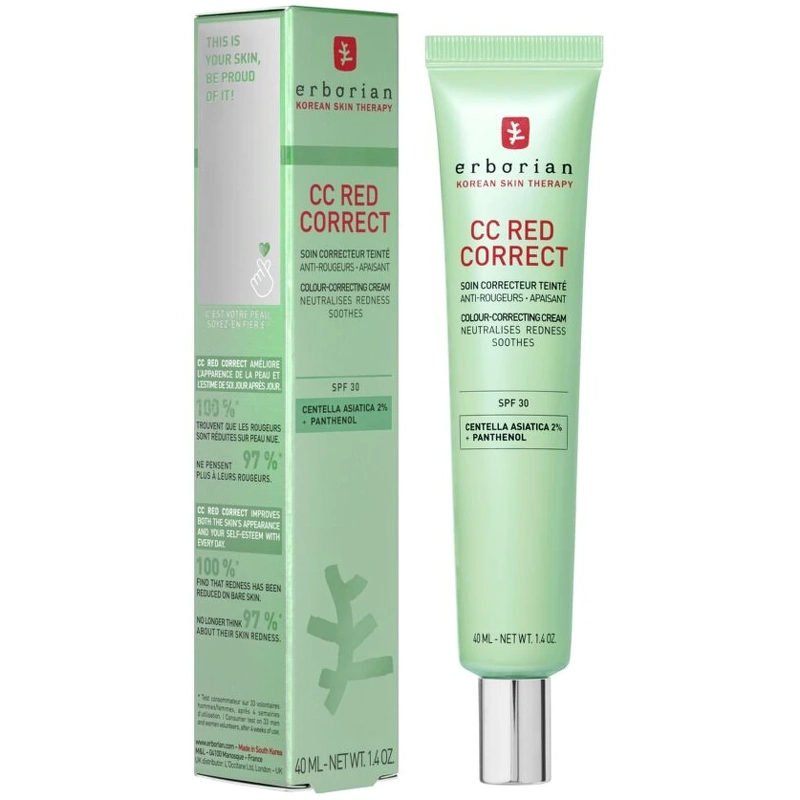 Erborian CC Red Correct er en tonet koreansk ansigtscreme, der effektivt modvirker rødme. Ved påføring neutraliserer den grønne tekstur straks rødme, hvorefter indkapslede pigmenter frigives og udjævner hudtonen. Giver let dækning for et naturligt og strålende resultat.