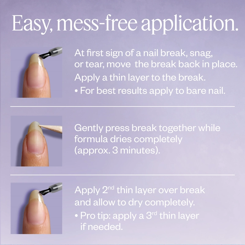 Den tynde, gennemsigtige, flydende neglelim tørrer hurtigt og efterlader ikke dine negle klistrede eller ujævne. Den skaber en glat finish, der er usynlig under neglelak. Desuden er den skånsom at fjerne, så du kan reparere din negl uden yderligere skade.