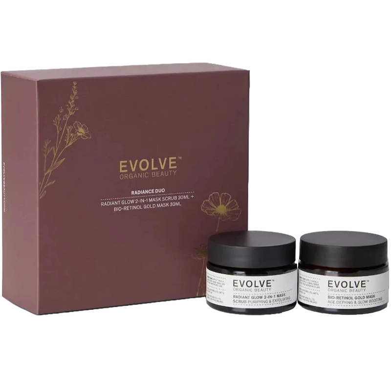 Evolve Radiance Duo er den ideelle gave til smuk og strålende hud. Æsken indeholder Radiant Glow Mask og Bio-Retinol Gold Mask, der renser, plejer og giver huden fornyet glød med naturlige, økologiske ingredienser.
