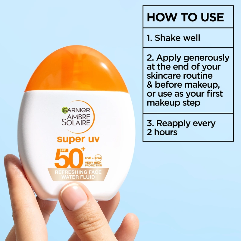 Garnier Ambre Solaire Super UV Refreshing Face Water Fluid SPF 50+ er en parfumefri solcreme til ansigt og øjenområde.