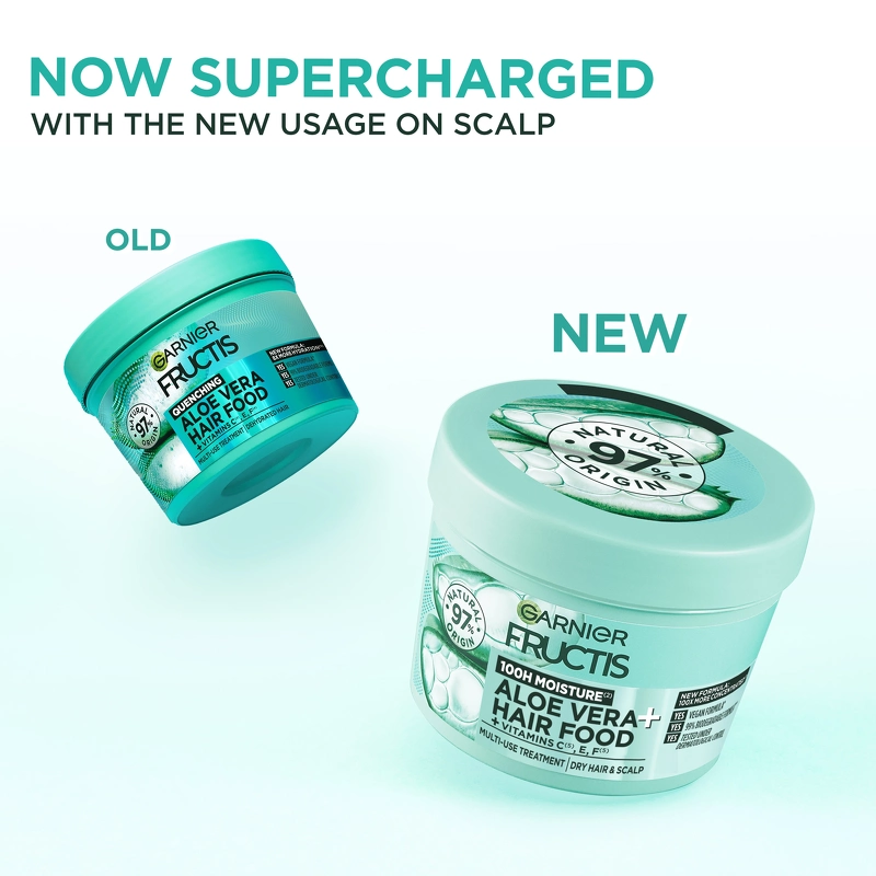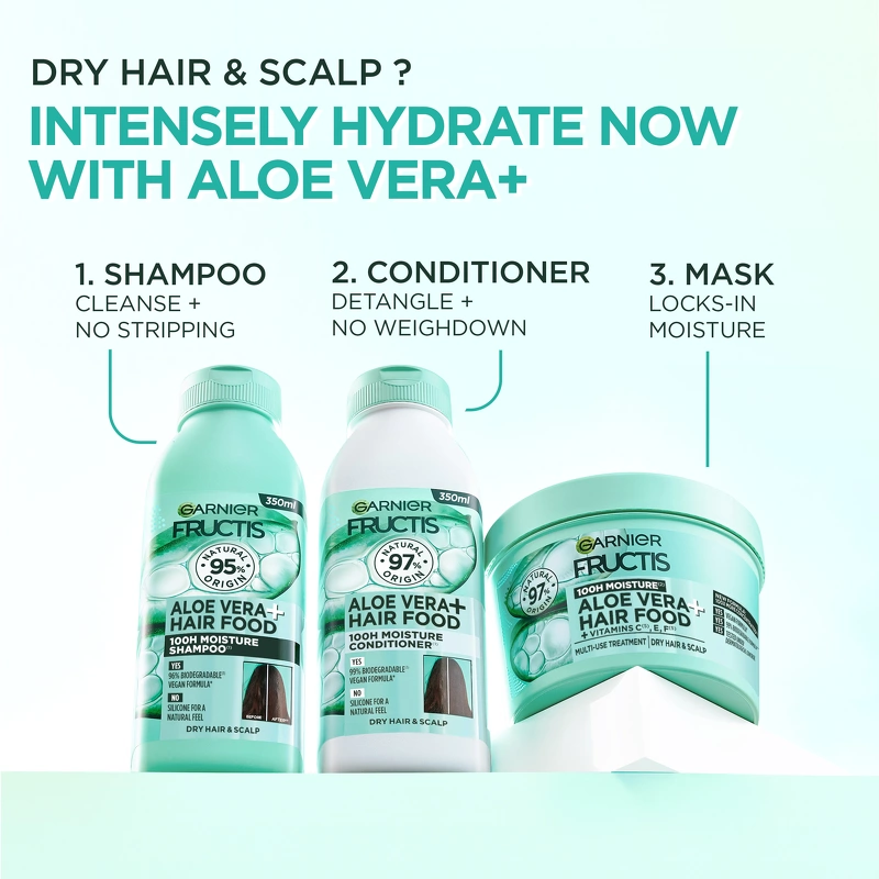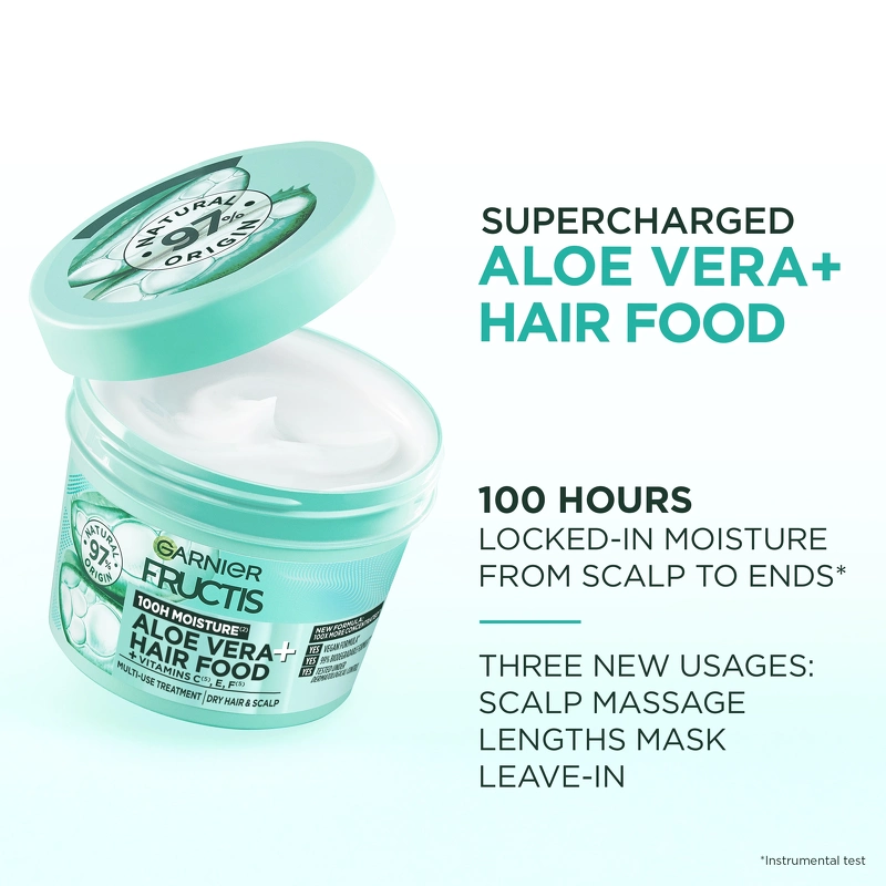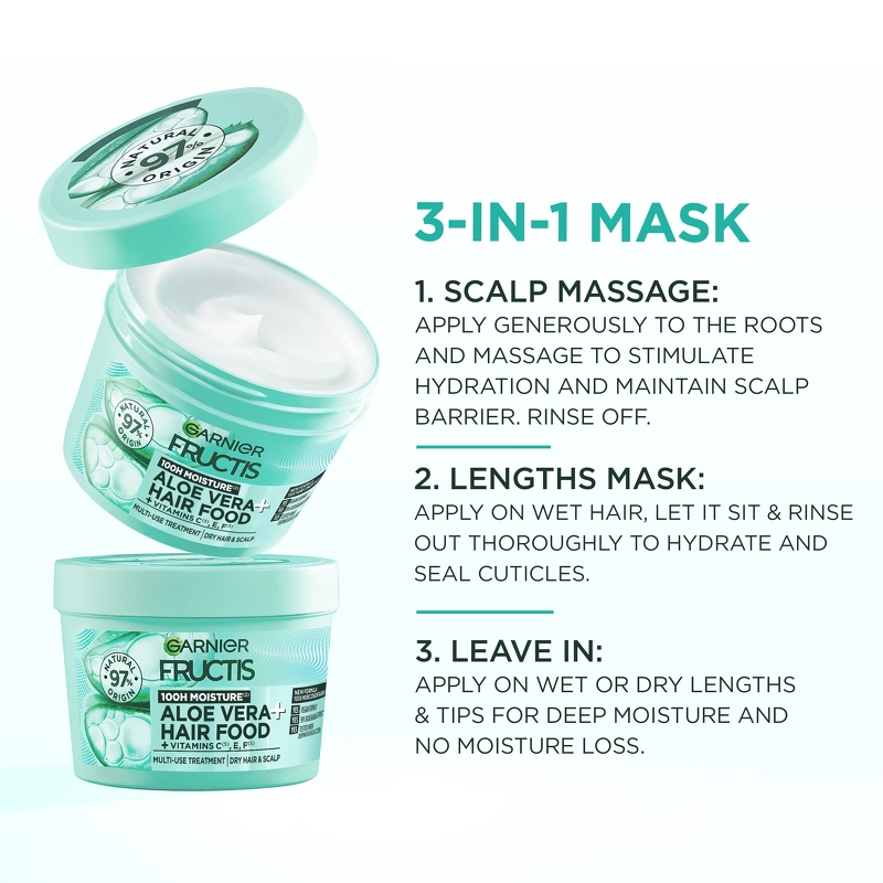 Garnier Fructis Hair Food Aloe Vera Mask er en 3-i-1 fugtgivende hårkur, som er velegnet til tørt hår og hovedbund.