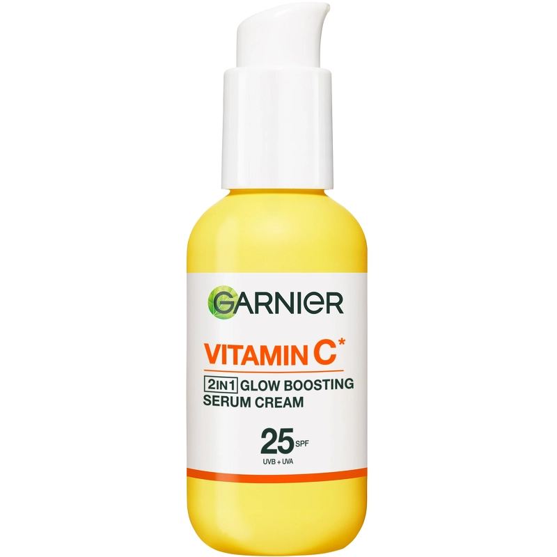 Garnier Vitamin C 2-in-1 Glow Boosting Serum Cream SPF 25 er et 2-i-1 hudplejeprodukt, koncentreret med 20% serum, der er beriget med C-vitamin*.